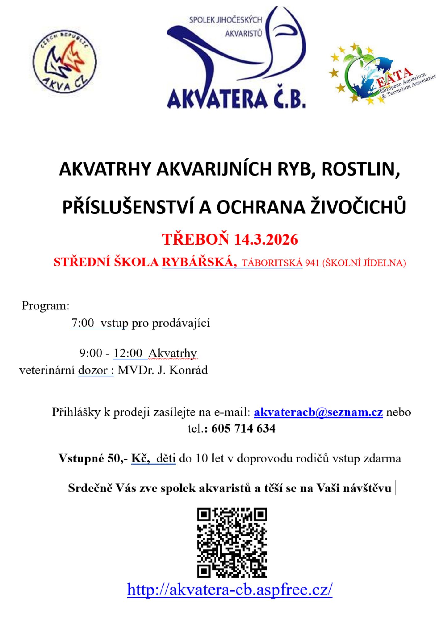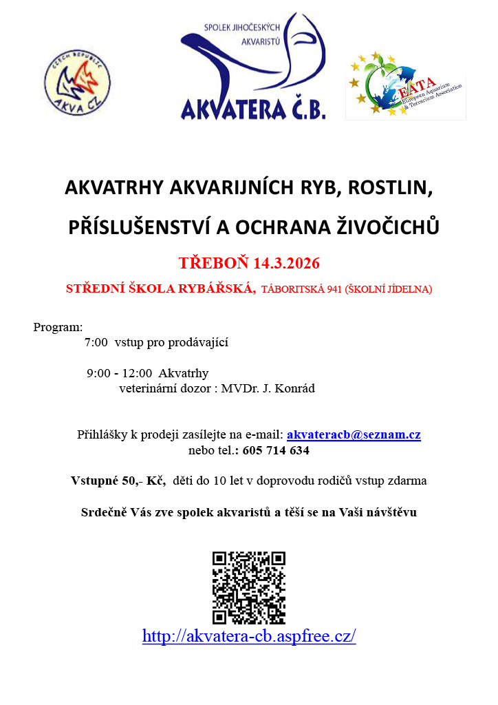 We warmly invite all aquaristics enthusiasts, from experienced breeders to newcomers, to the traditional Aquaristics Fair in Třeboň (Wittingau). Come by to enrich your aquariums, acquire equipment, or simply exchange ideas with experts.p>