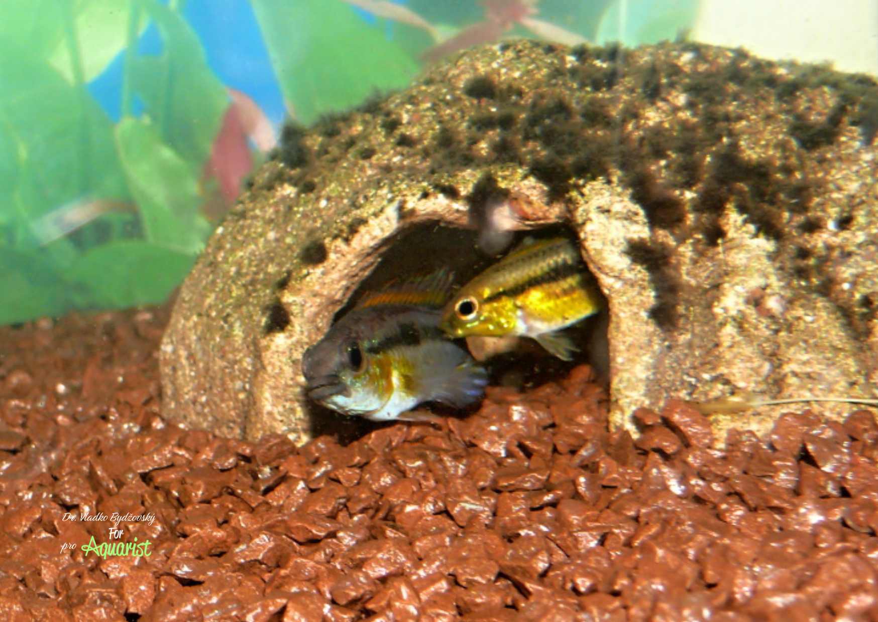 Breeding is not entirely easy. Soft water, ideally up to 2-3°dGH, with a temperature above 25 °C, pH between 5-6, and the addition of peat. For spawning, we then acquire a cave, on the ceiling of which the female lays around 40-50 eggs, usually even less. She takes care not only of the eggs but also of the hatched fry. Further rearing after the fry hatch is similar to that of other members of the genus Apistogramma.