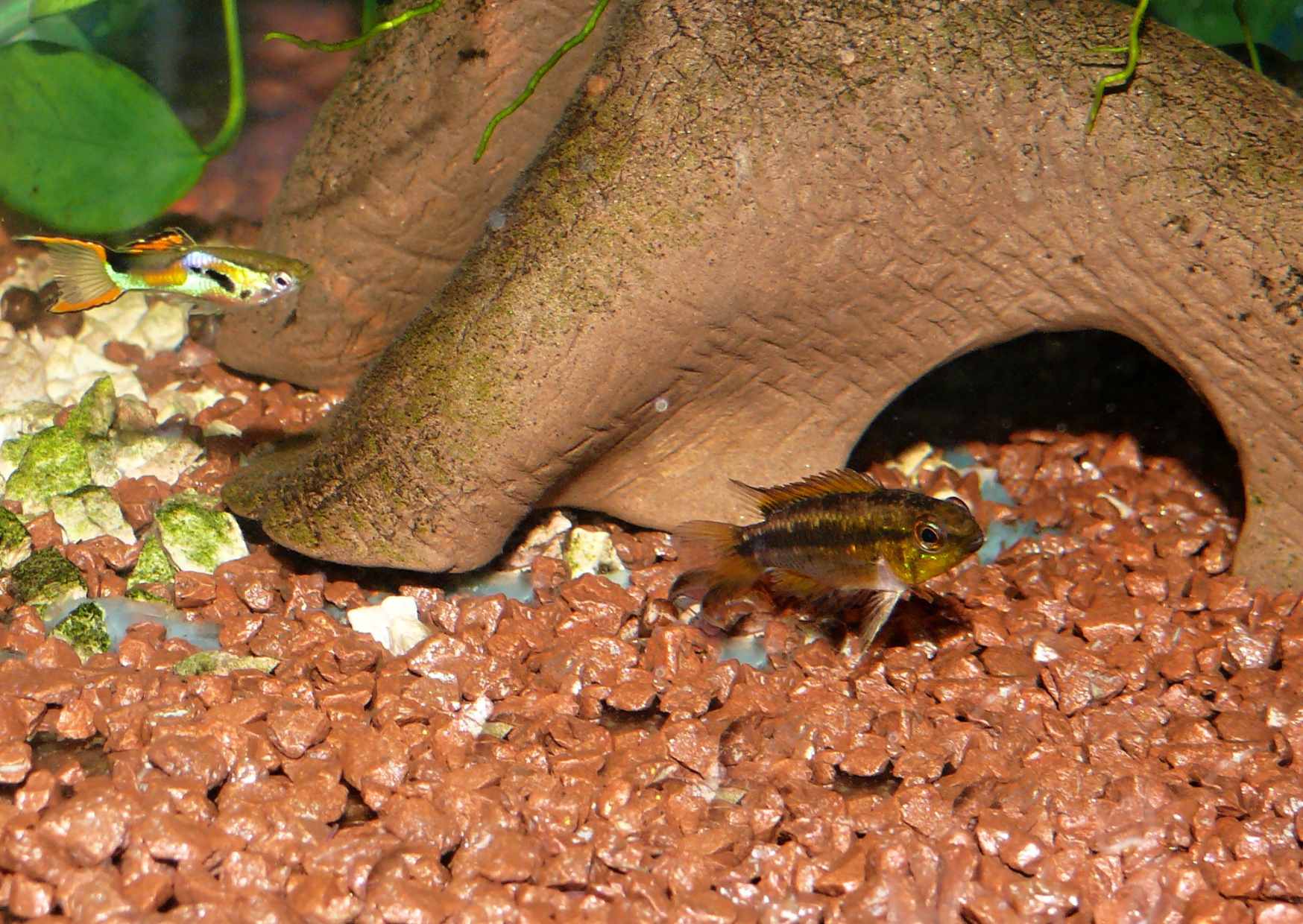 A sufficient number of hiding places is necessary, ideally from flowerpots cut in half, coconut shells, ceramic tubes, roots, or stones. Plants are also suitable, as cichlids do not damage them. Live food is ideal, or possibly frozen food.