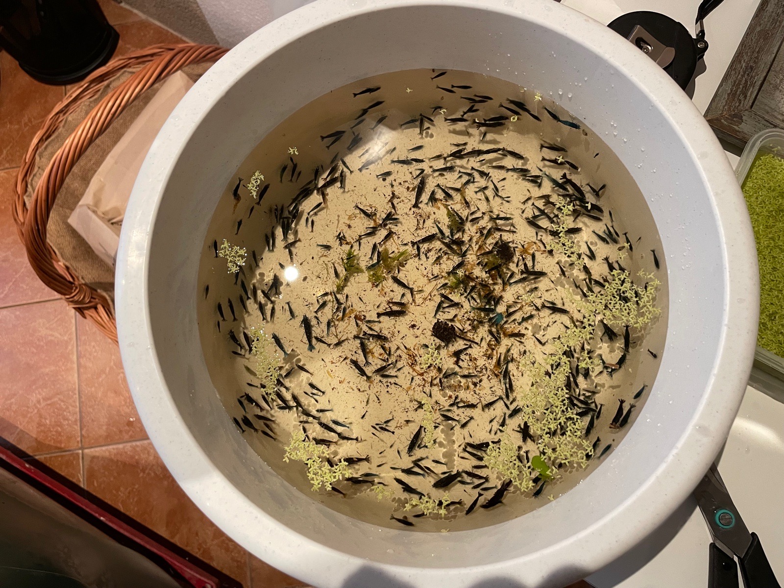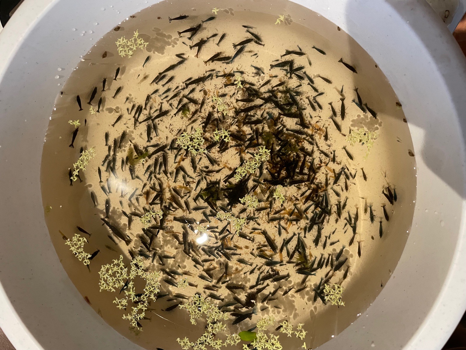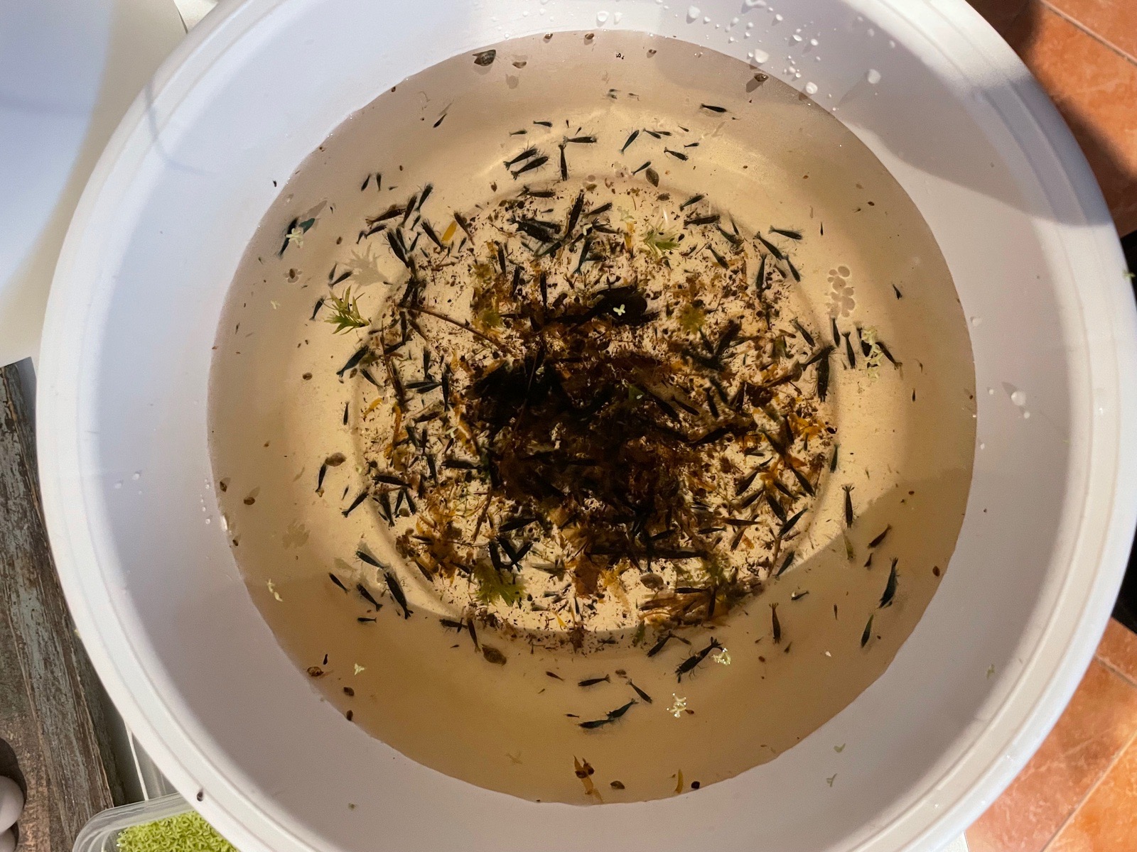 Po čtyřech měsících výlov krevetek z venkovního sudu. Počáteční obsazení cca 60 kusů. Nyní cca 800-1100kusu.