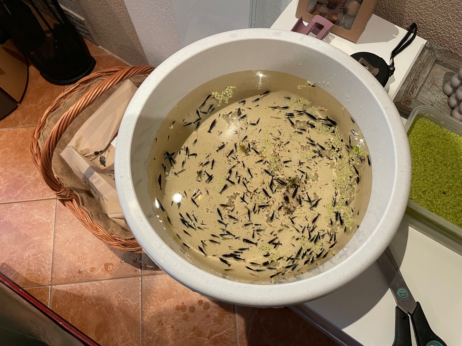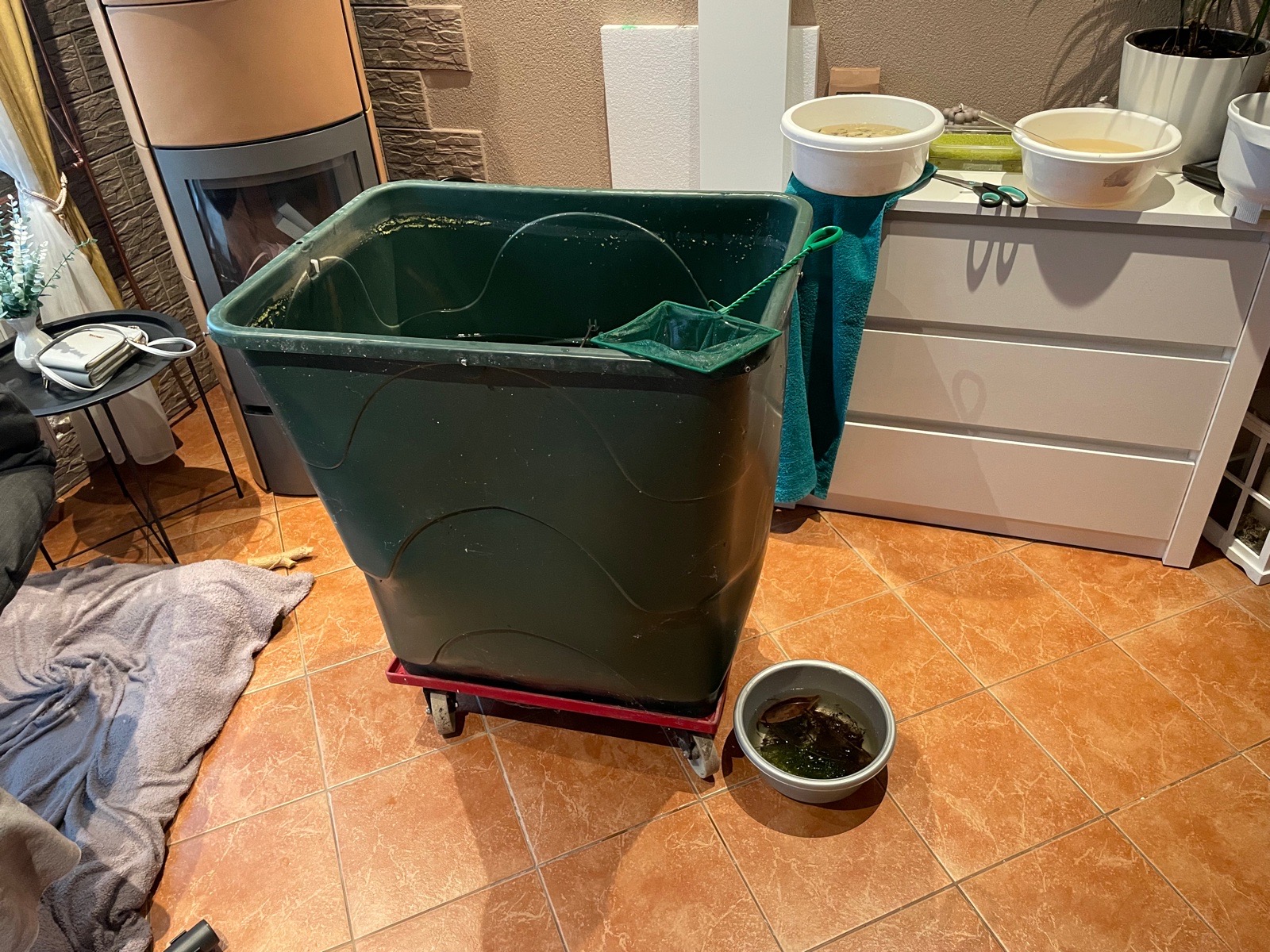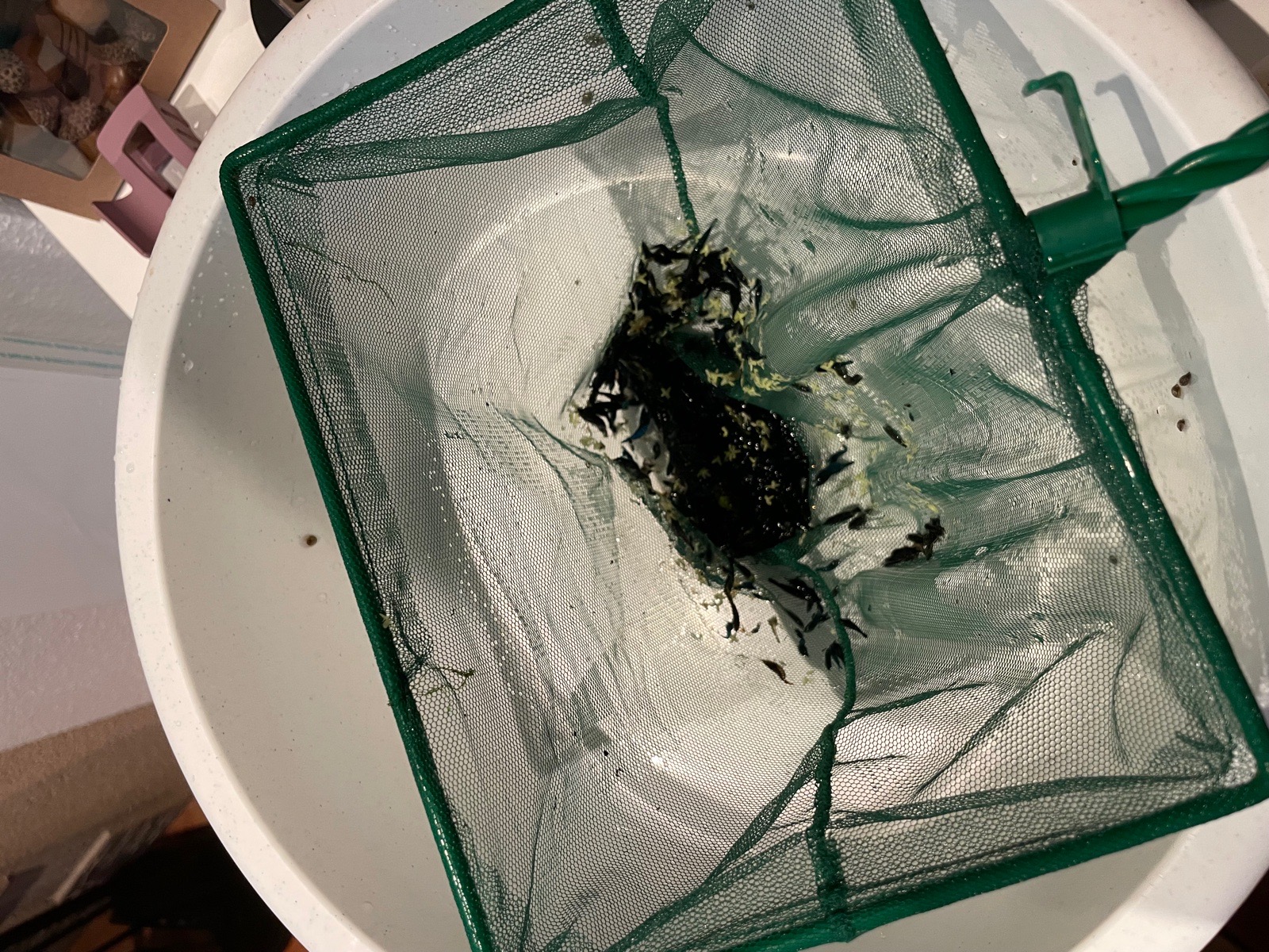 Po čtyřech měsících výlov krevetek z venkovního sudu. Počáteční obsazení cca 60 kusů. Nyní cca 800-1100kusu.