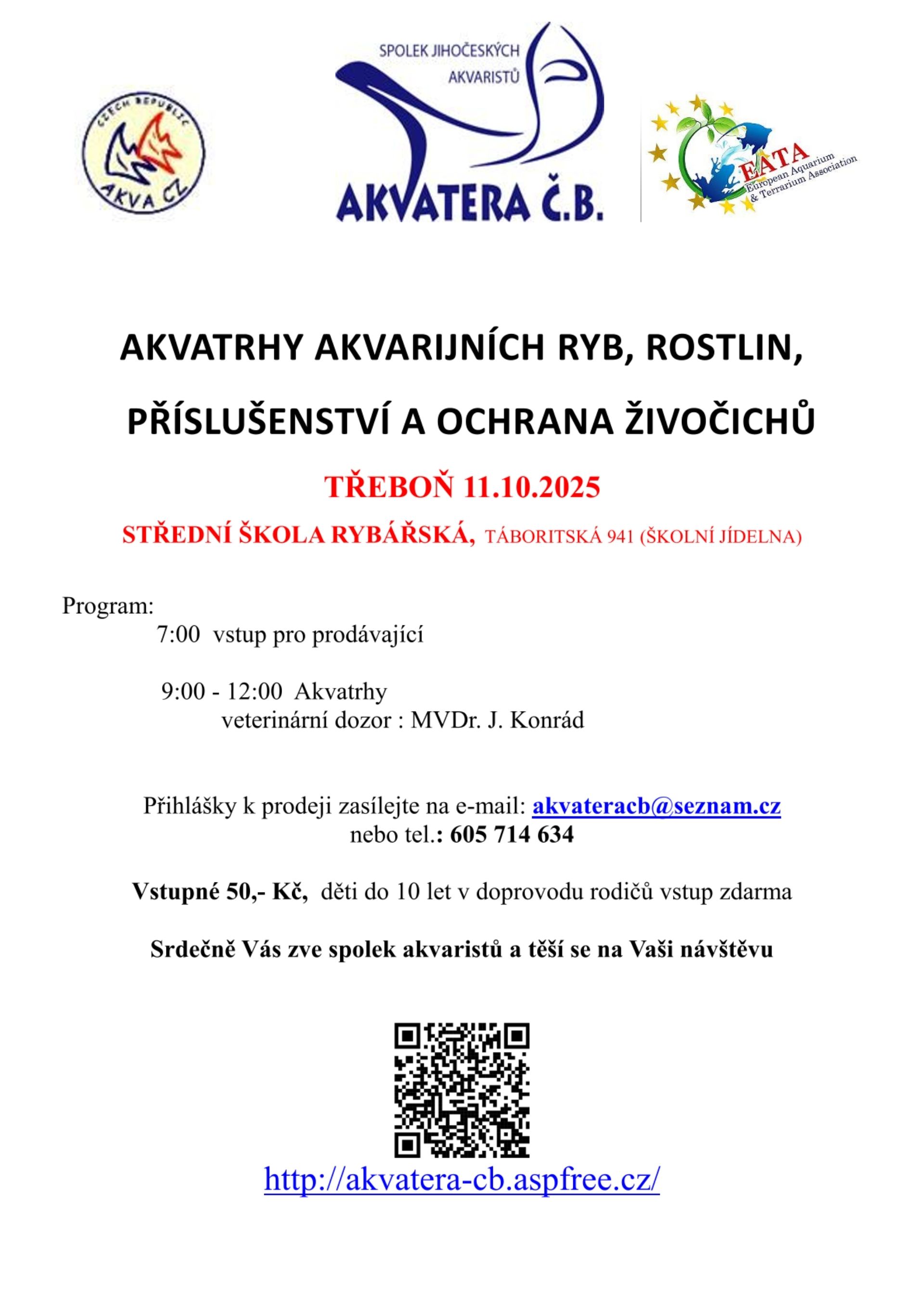 Přihlášky k prodeji zasílejte na e mail: akvateracb@seznam.cz, nebo tel.: 605 714 634