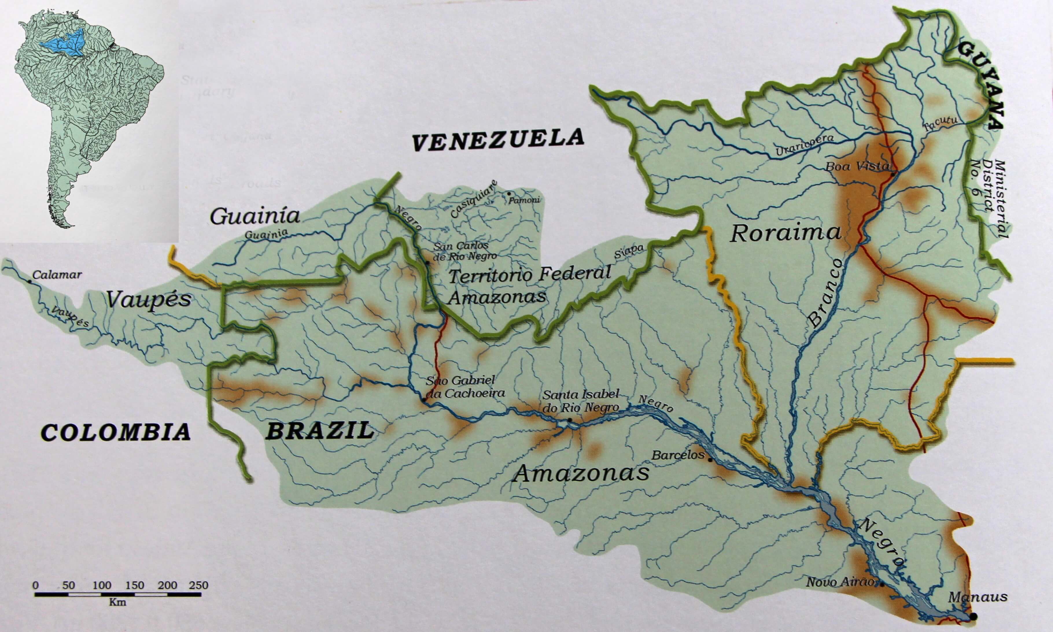 Jen tedy krátce k Rio Negru. Jeho povodí zabírá oblast větší než Francie, asi 700,000 km2. Pouze povodí Rios Madeira a Tocantis jsou větší přítoky vlastní Amazonky. Rio Negro je přibližně 2500 km dlouhé, největší jeho přítok je Rio Branco s ca 775 km. Tento přitok s kalnou vodou se nachází ve státě Roraima. Více než 90 % povodí řeky Negro je v brazilských státech Amazonas a Roraima, zbylých 10 % leží ve Venezuele a Kolumbii, méně než 1 % v Guyaně. Záplavová území Rio Negra jsou extenzivně vykácena.