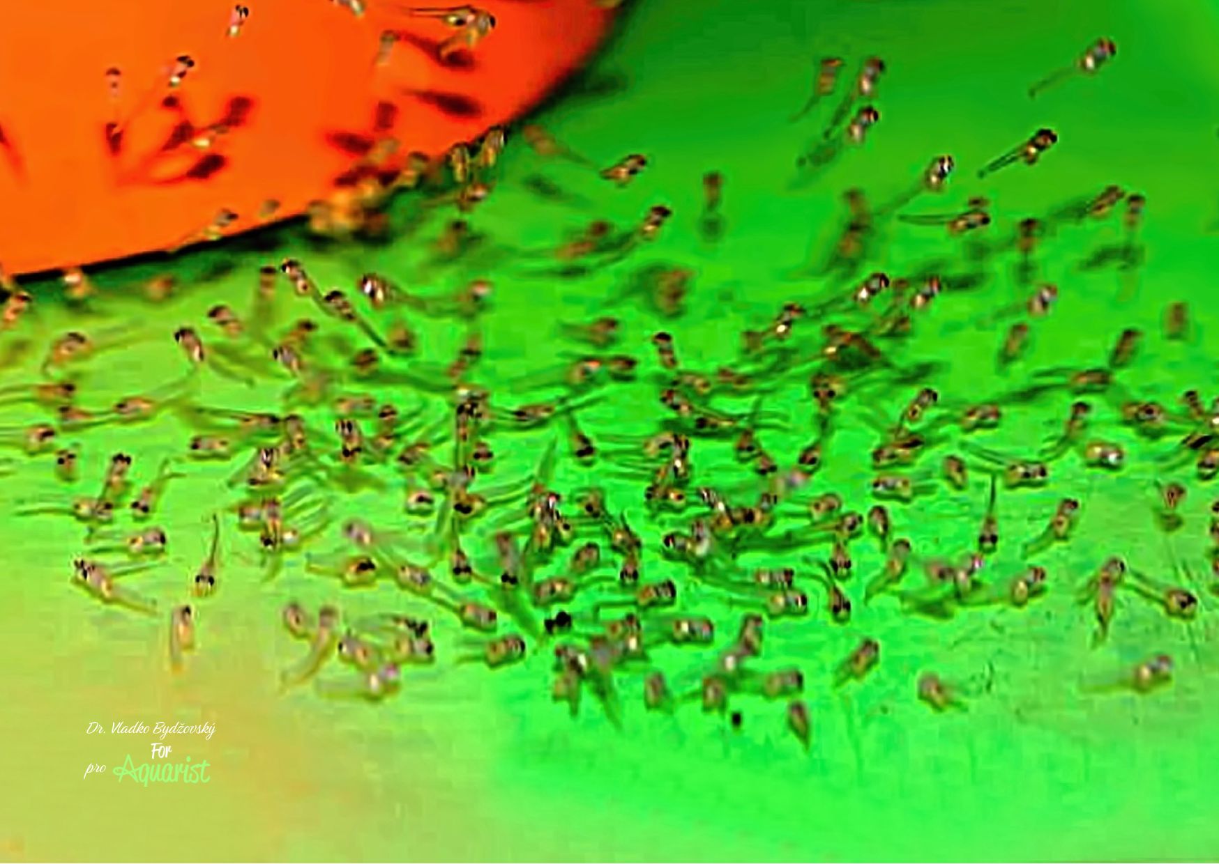 - Pár při tření, samice vpředu. Je vidět rozdíl v pohlavních papilách. Sameček ji má tvarovanou do špičky, samice má tupé zakončení.