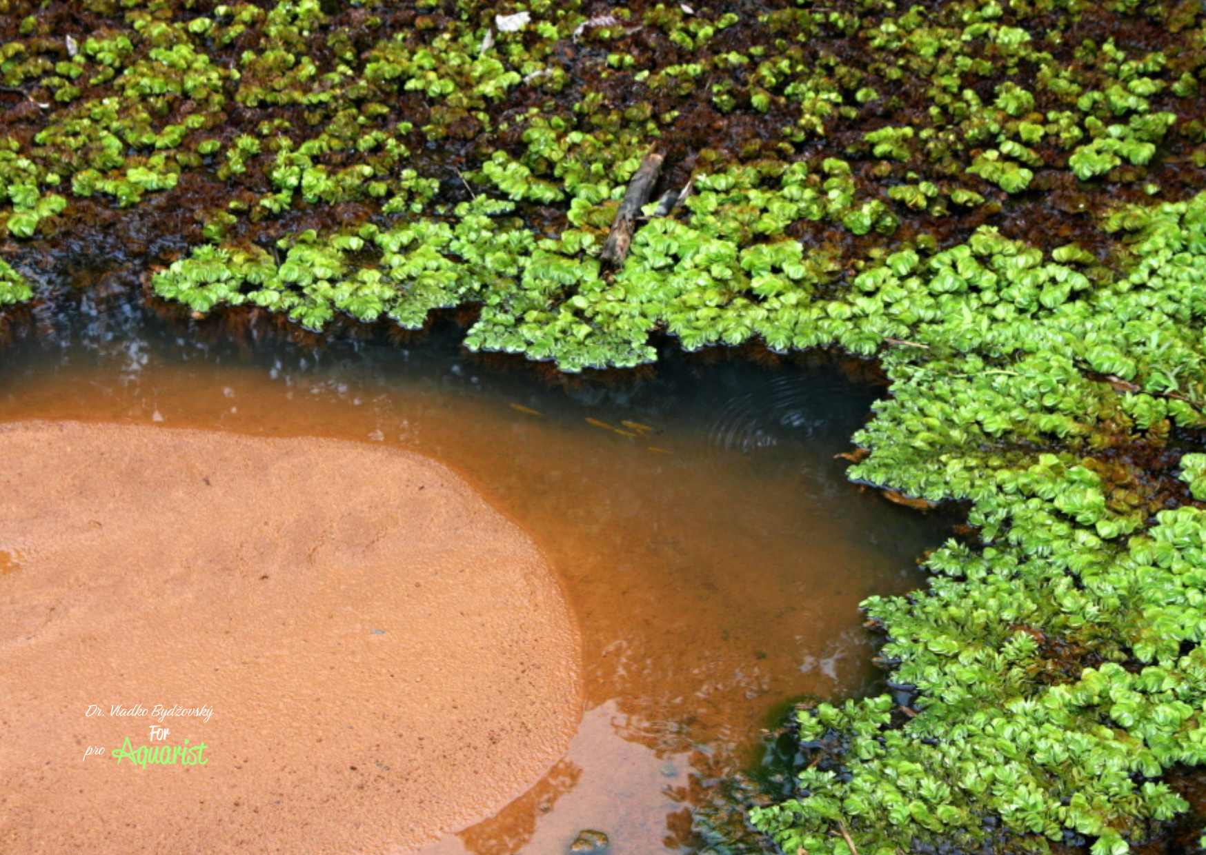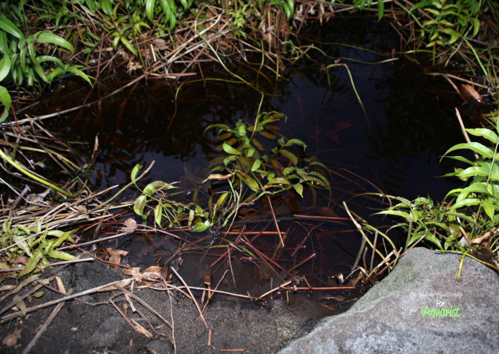 - Malá tůňka s černou vodou, pH 4,5, vodivost 47 µS/cm, teplota 27°C. Zde plavaly Sphaerichthys selantanensis (Čichavec tmavohnědý) a Betta anabantoides (Bojovnice lezounovitá).