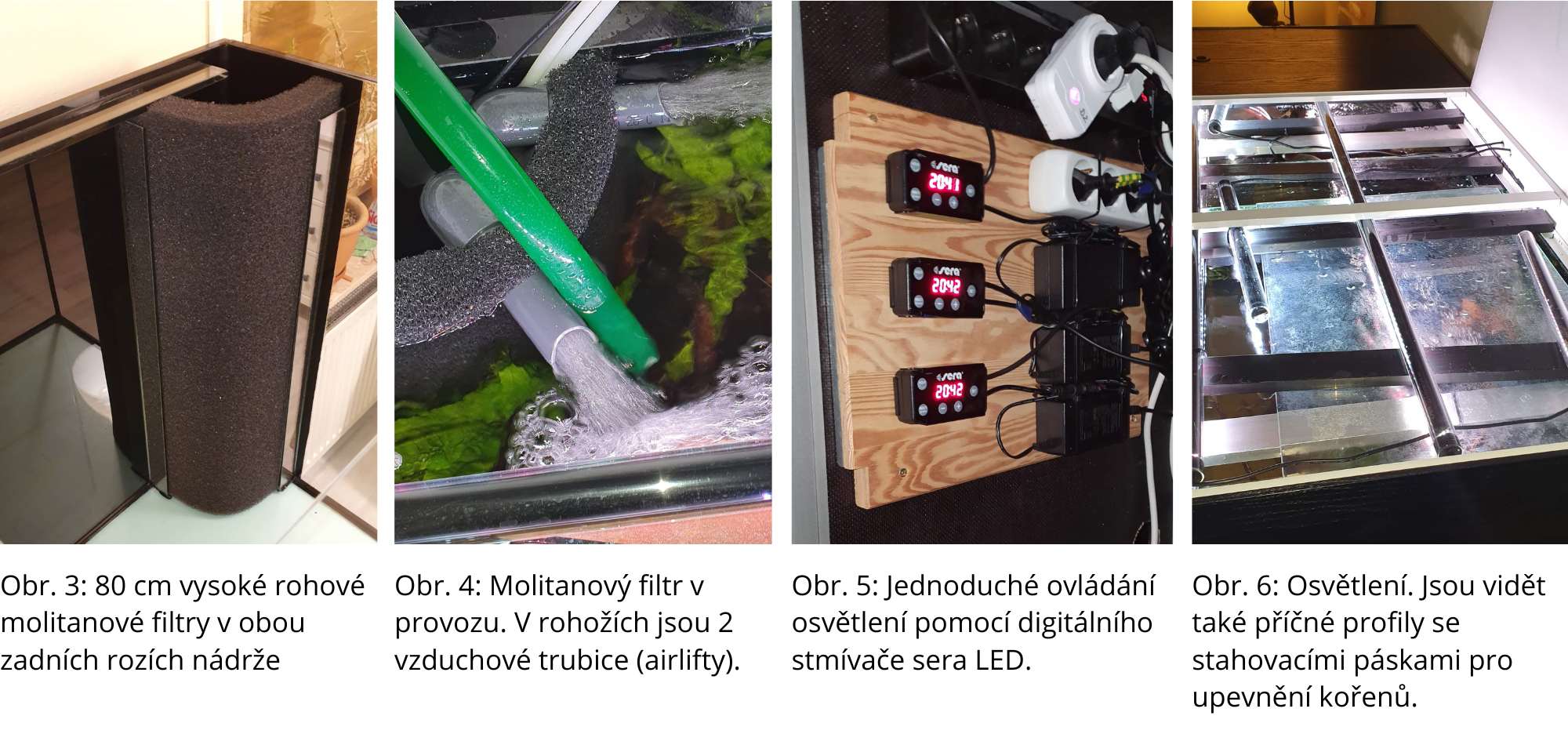 Filtr: V rozích jsou umístěny 2 HMF (Hamburg Matten Filter) z 4 cm silných černých rohoží s 20 ppi. Plocha každého je 0,25 m2. Dvě vzduchová čerpadla od GN s vnějším průměrem 25 mm. Poháněno čerpadlem AquaForte V30 umístěné ve vedlejší místnosti. V počáteční fázi provozu rohoží byly podporovány zaběhnutým EHEIM professionel 4+ 600 z jiného akvária.