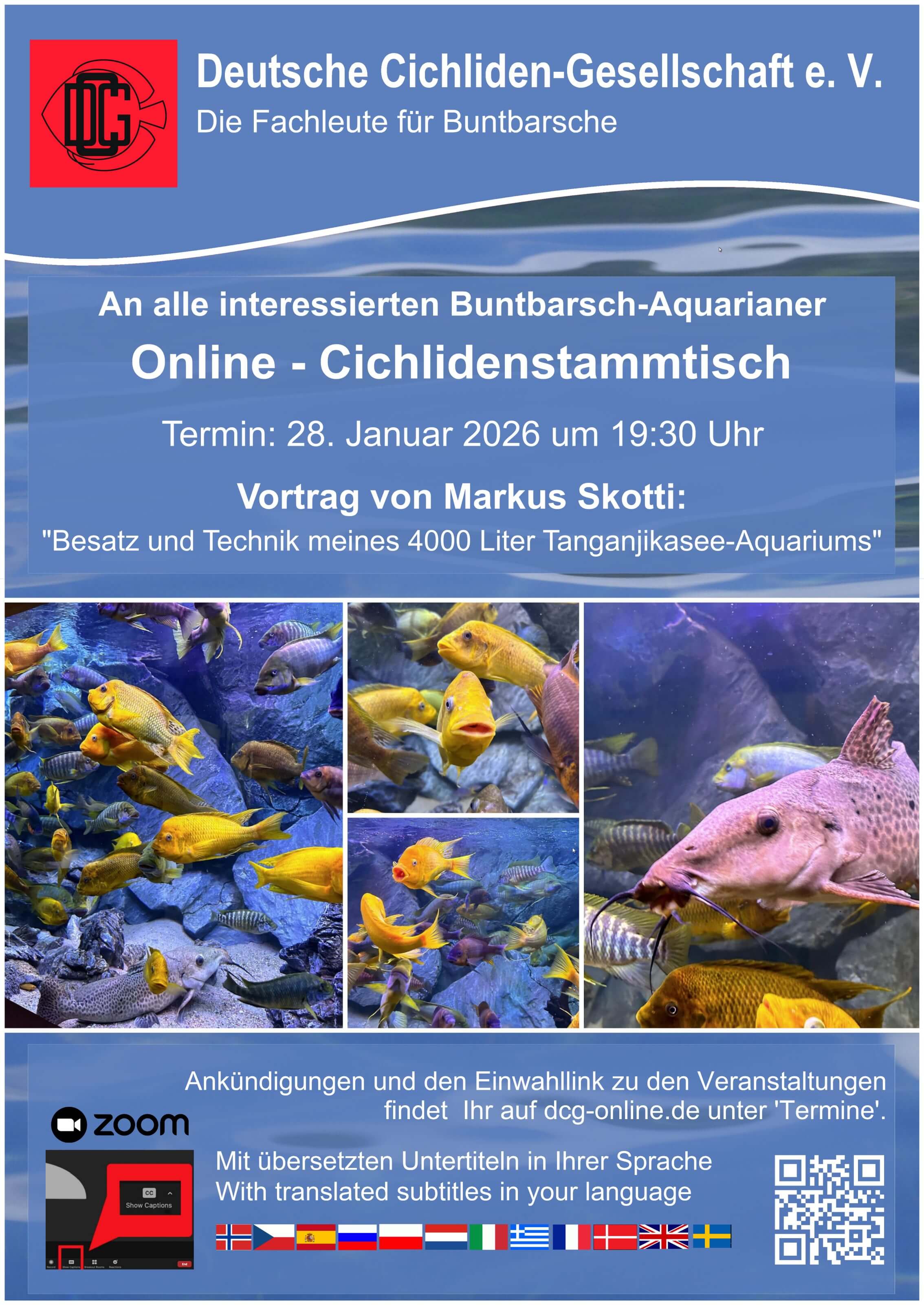 Deutsche Cichliden-Gesellschaft e.V. (DCG) srdečně zve všechny české akvaristy na unikátní online setkání. Tentokrát nahlédneme do soukromí zkušeného akvaristy Markuse Skottkiho a prozkoumáme jeho monumentální nádrž.