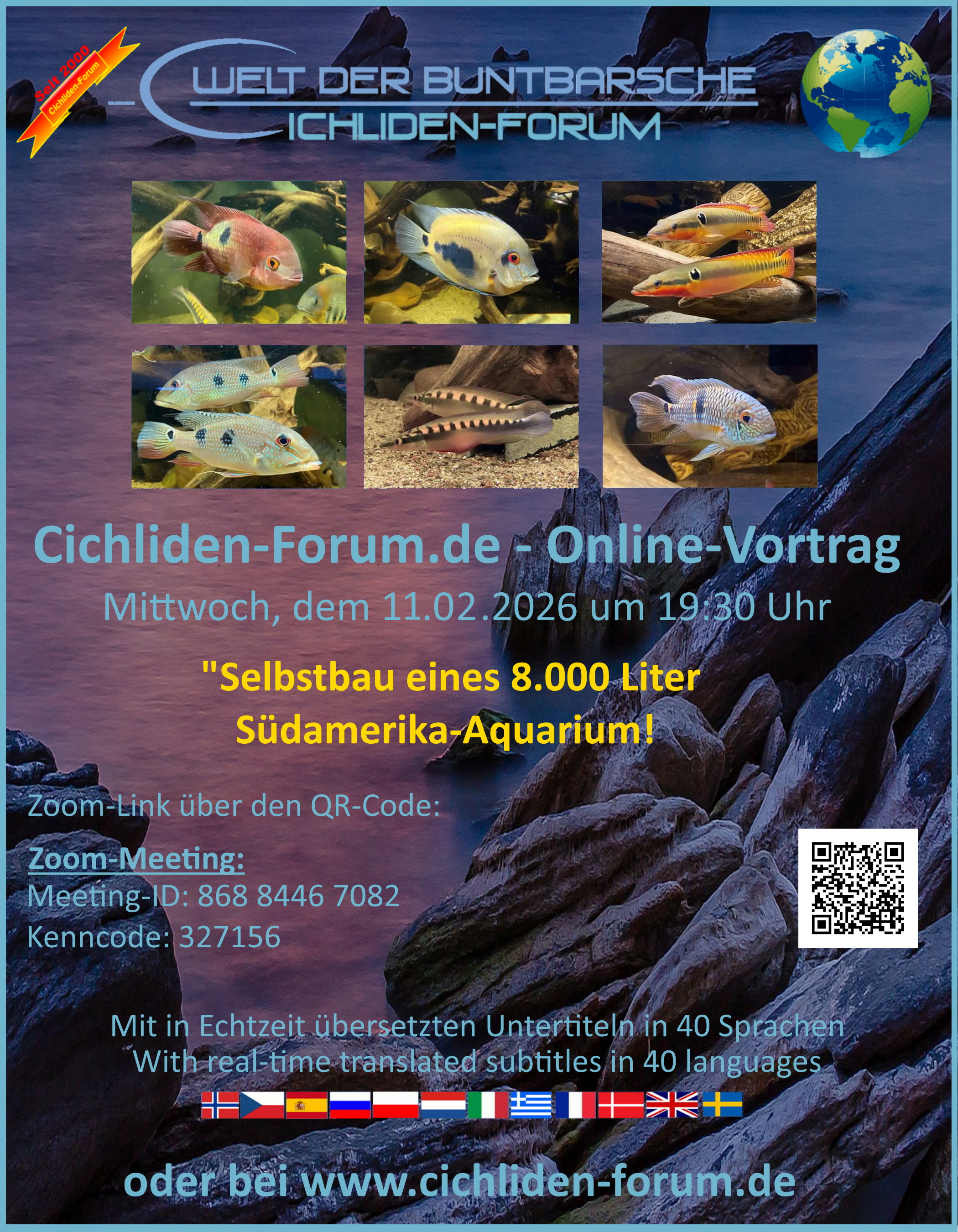 Mezinárodní skupina Cichliden-Forum zve všechny akvaristy na exkluzivní online přednášku Haralda Khadena, který nás provede stavbou svého gigantického 8 000litrového biotopního akvária.
