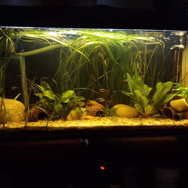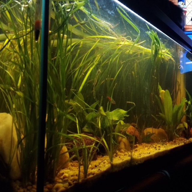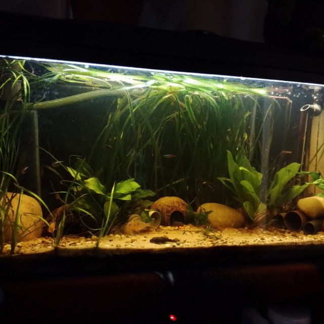 Jednoduchá nádrž bez hnojení, rostliny převážně Vallisneria, echinodor,na dně úkryty pro krunyřovce ale i pár apistogrammy. Dno písek 1,5mm,filtrace čerpadlo JK202 a biomolitan s upraveným výtokem.Osvětleni denní bílá led od diversy (kelviny teď neřeknu). Akvárium bylo převážně pro páry mikrogeophagus raminezi (samice přišla o samce ale zůstal jeden potomek), apistogramma Borelli,cihlidka vysokoploutvá (taky přišla o partnera). .. Sem tam ještě nějaké kameny jako dekor.Neonky a Tetry jsou přeživší od terčovců.