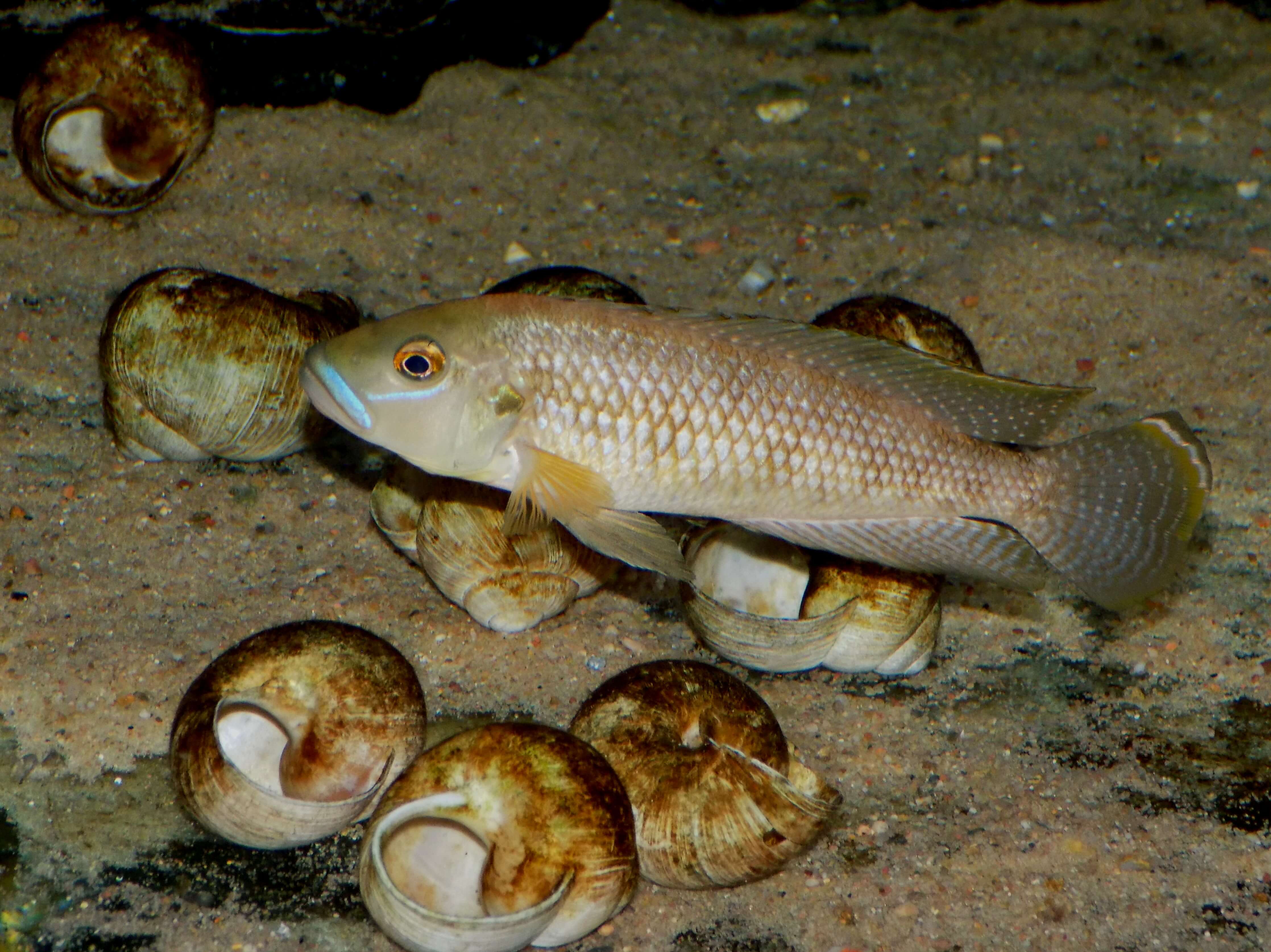 Największy samiec broni w akwarium terytorium o średnicy około 30 cm, gdzie zgromadził muszle z całego akwarium i stopniowo wabi samice do tarła. Pozostałe samce pływają po reszcie zbiornika bez większych problemów. Innych gatunków ryb prawie nie zauważają.