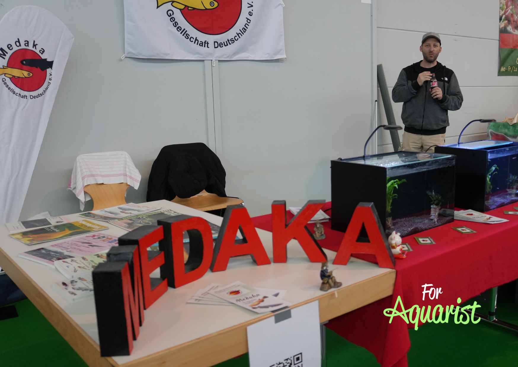 Jak już wspominał Tomasz Kučera z Vivarium Mělník wwywiadu dla ForAquarist, Medaka jest nowoczesna. Potwierdził nam to akwarysta stojący przy ladzie z dużym napisem Medaka. Tylko na chwilę się zatrzymaliśmy, a już nas witał. Wyjaśnił nam, że w ostatnim czasie nastąpił duży wzrost różnych grup, np. na FB, i że wyhodowanych form tej interesującej i właściwie do stawów dość praktycznej rybki jest niezliczona ilość. Od razu pochwalił się swoimi hodowlanymi sukcesami w postaci rybek z wydłużonymi płetwami i kolorowymi wariacjami. Muszę powiedzieć, że ten gatunek ryb oraz opowieści akwarysty w stoisku całkiem mnie zachwyciły, że zaczęłam się zastanawiać, czy nasze jezioro nie potrzebowałoby jakiejś Medaki.