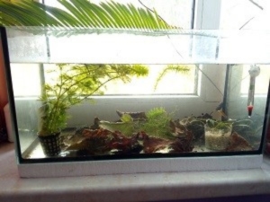 Jak już pisałem wcześniej, hoduję je w zbiorniku umieszczonym na parapecie okna. Zaletą jest, że latem, gdy słońce oświetla akwarium, zaczyna się tworzyć zielony osad, do tego stopnia, że nie widać do akwarium. Ta mętna woda im odpowiada, ponieważ ją filtrują i w ten sposób dostają dodatkowe źródło pokarmu.