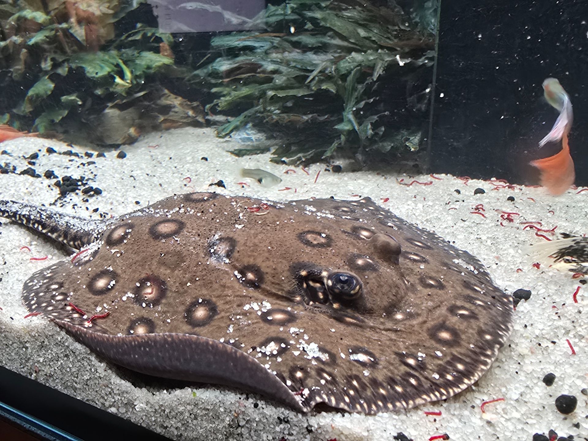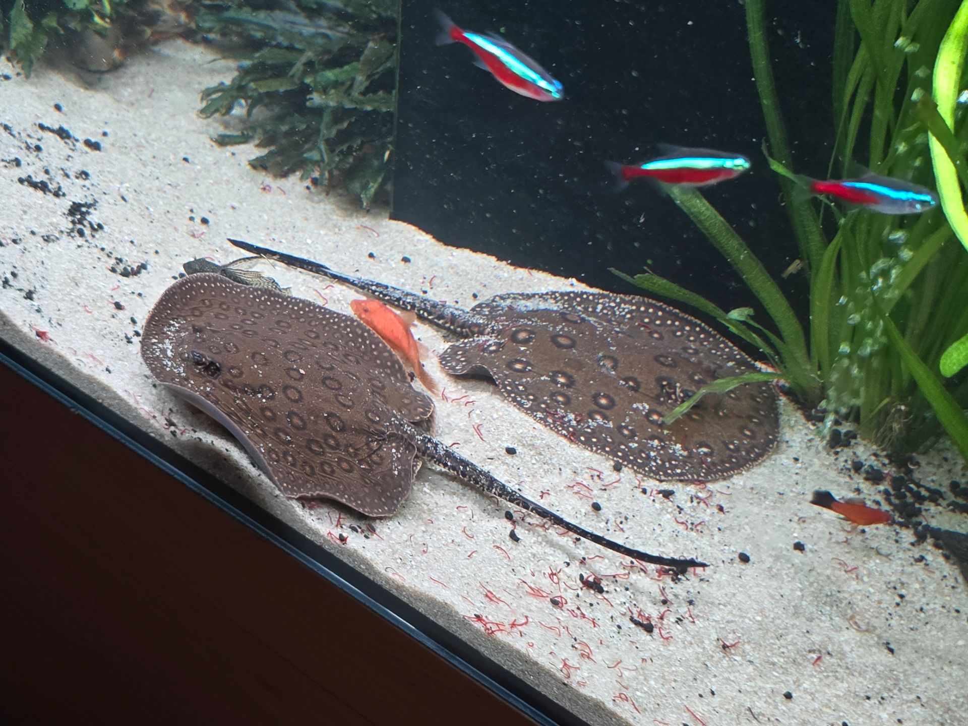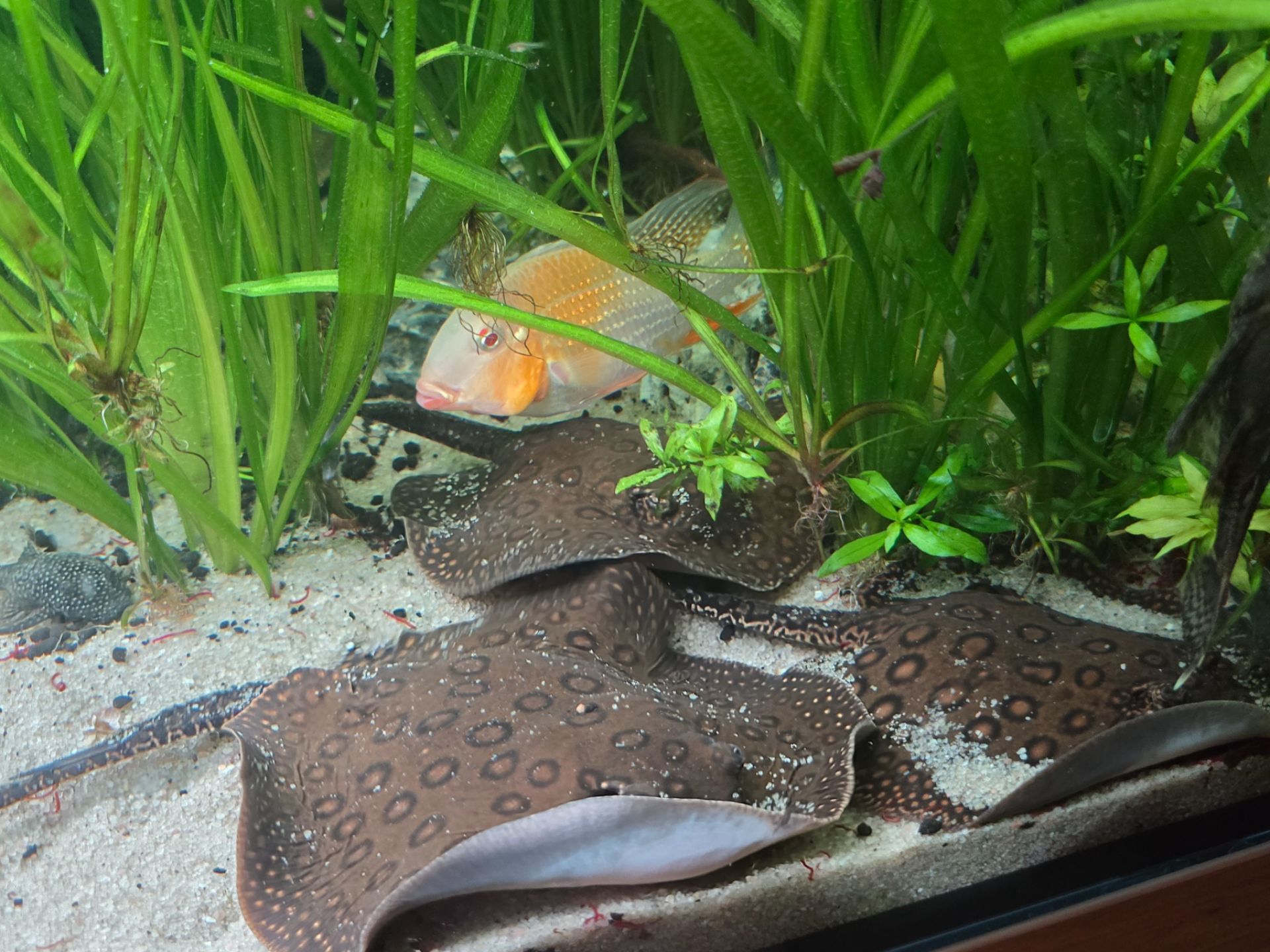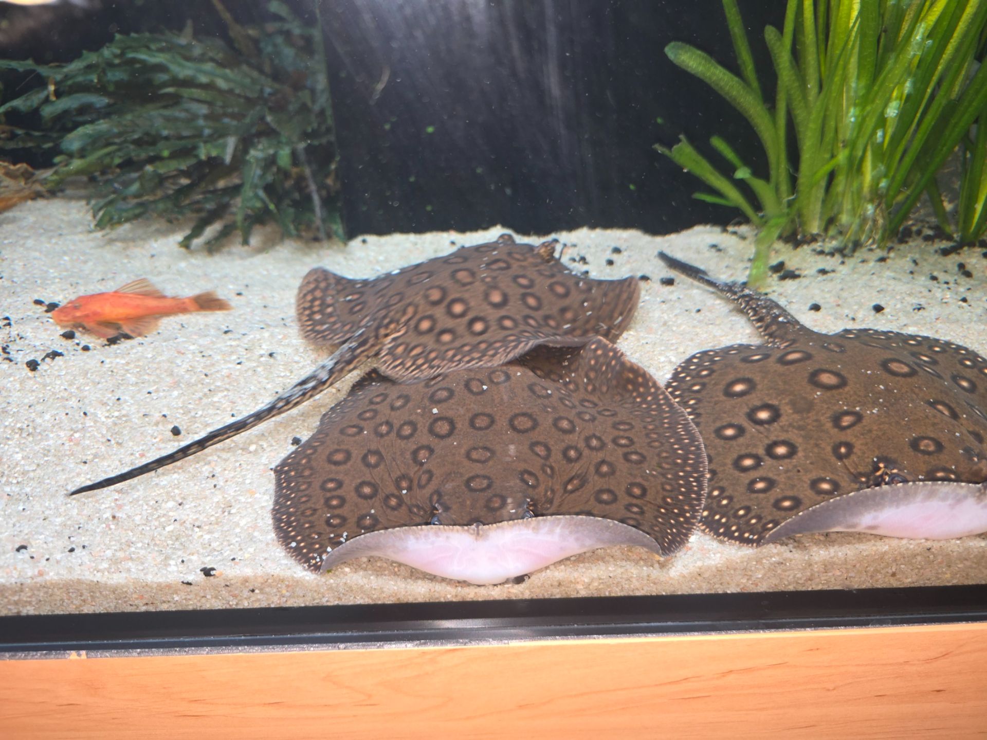 Prodám Potamotrygon motoro Mini Royal marbled, 4 ks (2 páry). Narozeni 26.10. 2024. Velikost 15+ cm. Samice v dospělosti dosahuje cca. 40 cm, samec je menší. Jsou navyklí přijímat nasekané grundle i mušle, patentky (živé i mražené) a také baby krevety (nevařené). Cena 4000 Kč/ks.