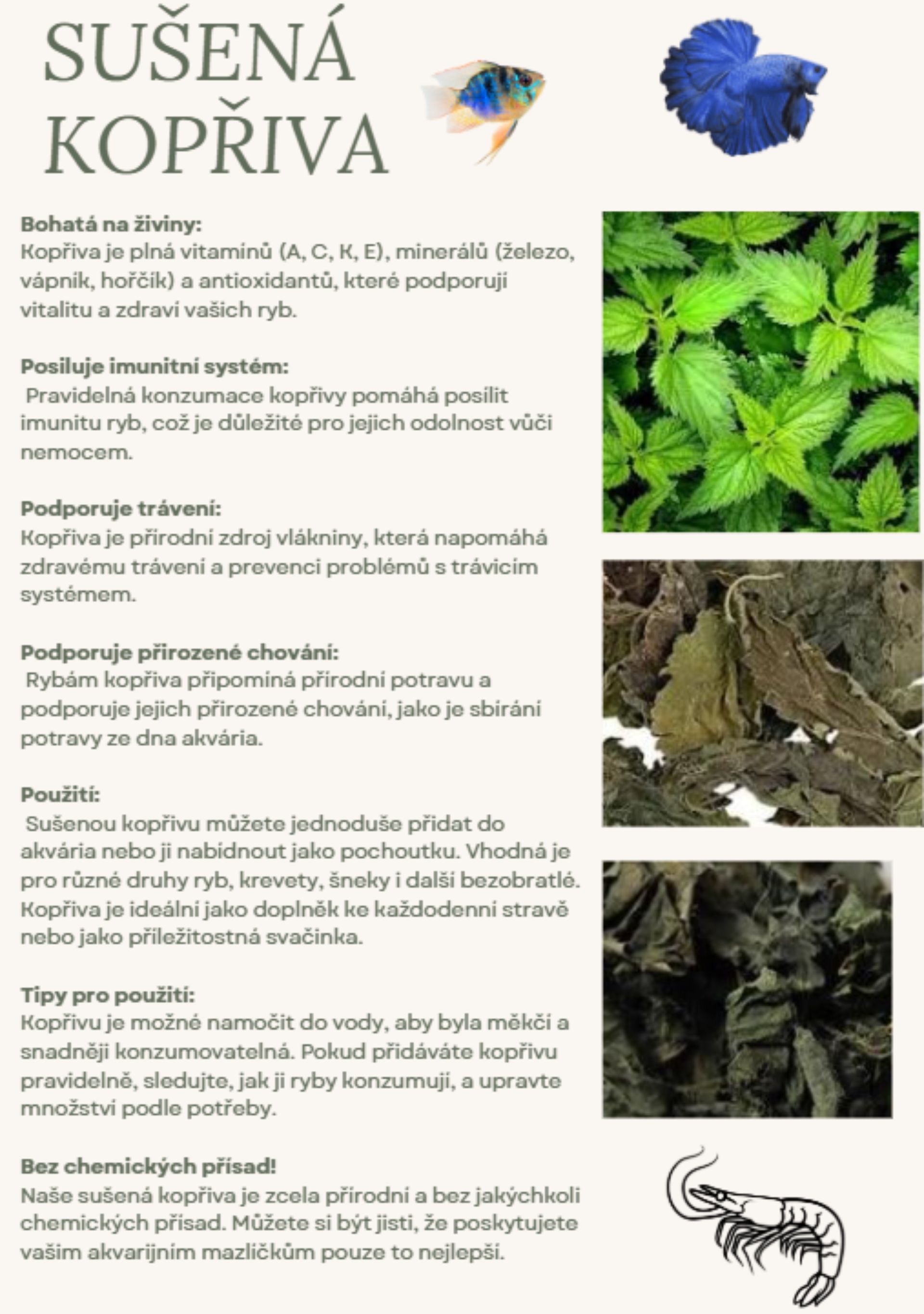 Rybám kopřiva připomíná přírodní potravu a podporuje jejich přirozené chování, jako je sbírání potravy ze dna akvária.
