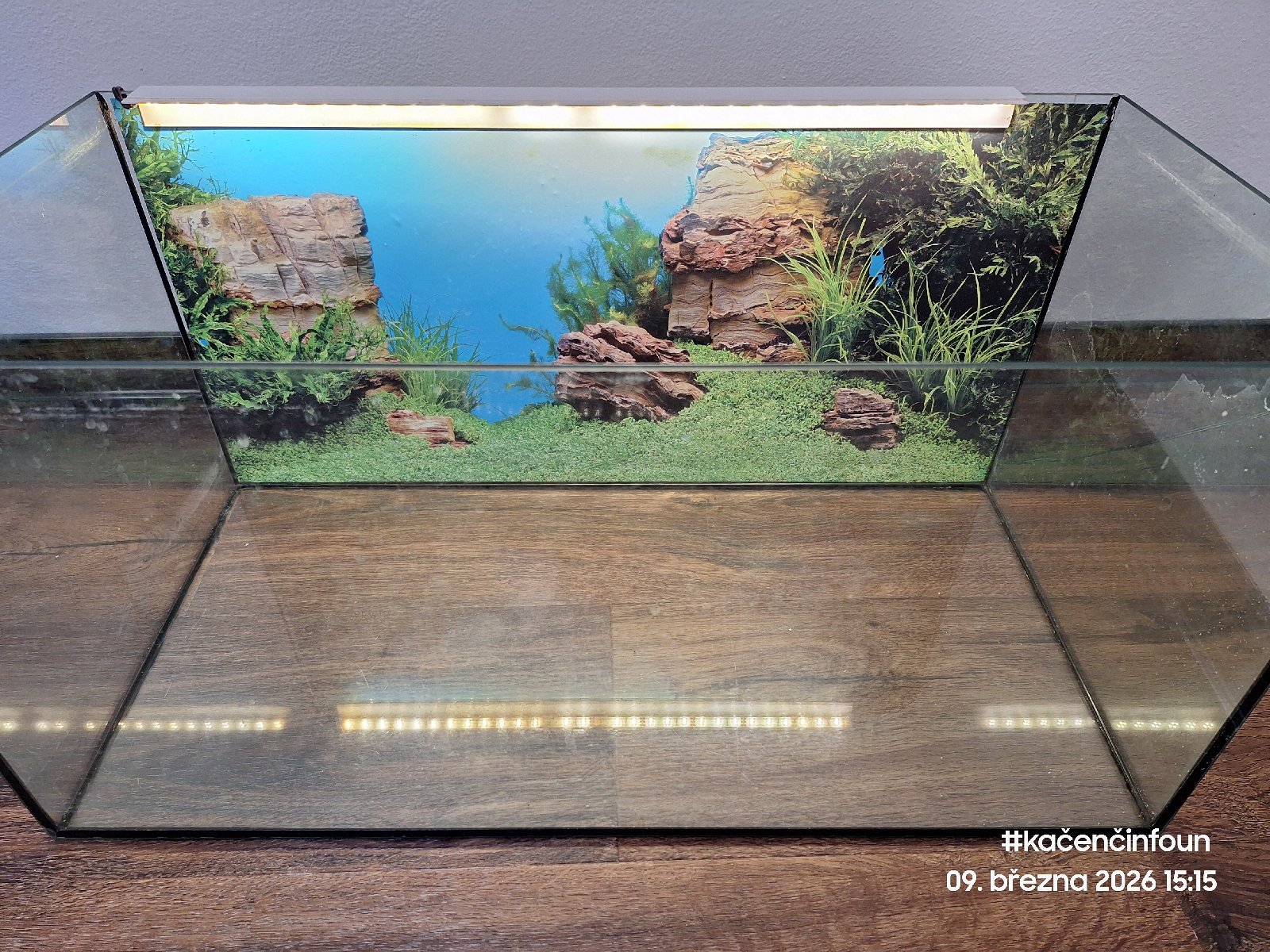 Akvárko šířka 60 cm, výška 30 cm, hloubka 30 cm. S LED osvětlením na zadní hraně, lepený teploměr + topítko + filtr + dekl.