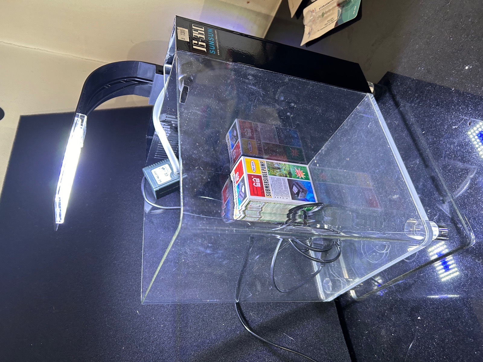 Nabizim akrilove akvarium v rozmeru 26cm dlouhy 18cm siroky 25cm vysoky s obaveni;svetlo + filtr+ molitan