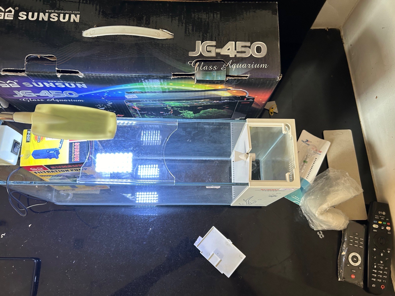 Nabizim moderny akvarium v rozmeru 45cmx11cmx21cm s vybavenim filtr + svetlo.p>