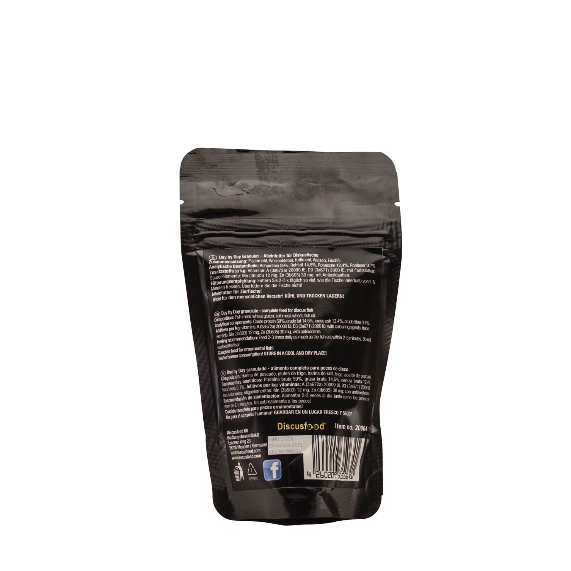 Vysoký obsah bílkovin zajišťuje rychlý růst a odpovídající obsah vlákniny pro rychlé trávení potravy které nezpůsobuje zácpu. Vysoký obsah vitaminových doplňků a stopových prvků zajišťuje, že Discusfood Day by Day je skvělé krmivo pro zlepšení celkového zdravotního stavu a odolnost ryb. Vysoký obsah xantinu (280 mg / 80g) umožňuje v krátké době silnou sytost červeného zbarvení ryb, stejně jako tmavší modrou barvu . Granule nevyžadují předchozí namáčení, nemění svůj objem, pokud jsou vystaveny vodě. Nekalí vodu.