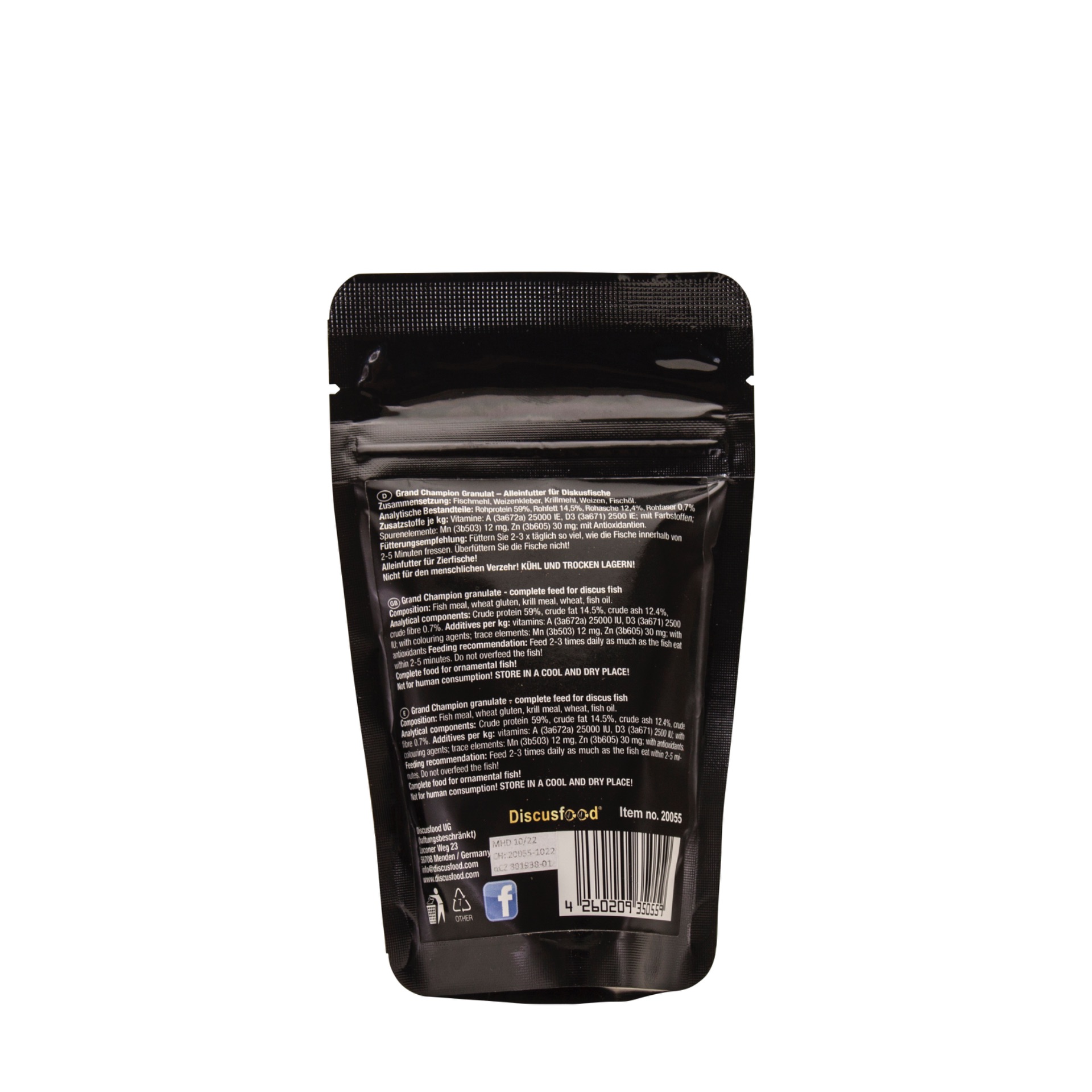 Díky jemné struktuře a atraktivní vůni ryby bezproblémově přijímají krmivo již od prvního podání. Terčovci se na ně snadno zvyknou. Vysoký obsah bílkovin zajišťuje rychlý růst, a odpovídající obsah vlákniny pro rychlé trávení potravy. Vysoký podíl vitaminových doplňků a stopových prvků, způsobuje zlepšení celkového zdravotního stavu a odolnost ryb.Vysoký obsah astaxantinu (700 mg / 80 g), stanoví v krátkém čase silné červené zbarvení krmení ryb. Doplněk beta-glukan dodatečně posiluje imunitní systém ryb, působí jako stimulant imunitního systému. Discusfood grand Champion také působí preventivně. To vše díky obsahu extraktů z česneku a cibule, které přirozeně omezují růst mikroorganismů, jako jsou bičíkovce. Krmivo nevyžaduje předchozí namáčení, granule nemění svůj objem.
