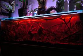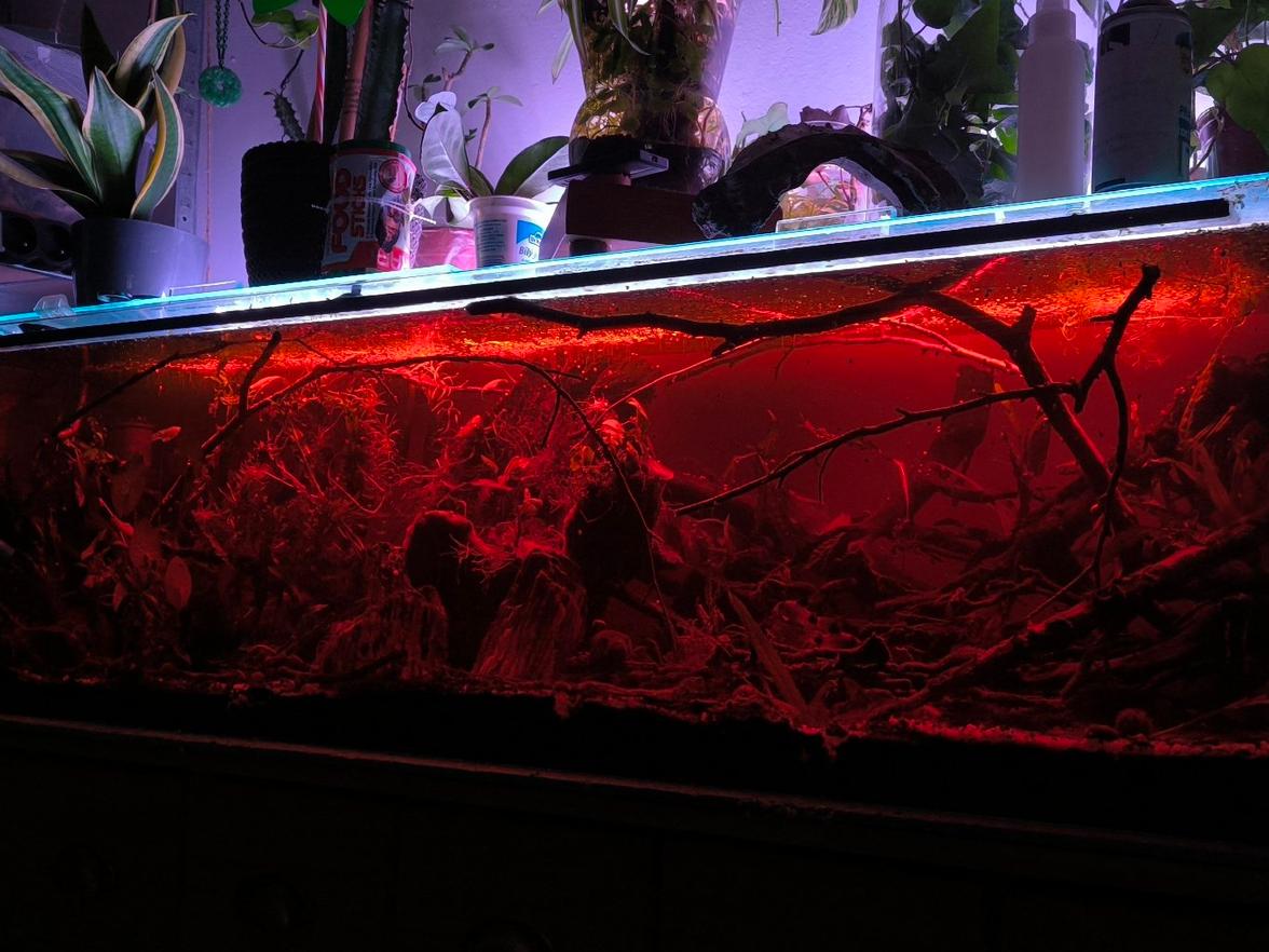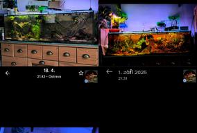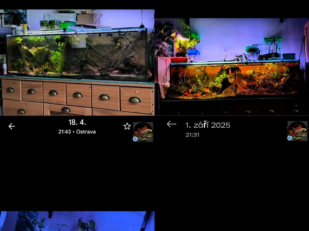 Ještě stále Low tech akvarium, kde jedinou techniku zahrnuje čerpací hlava jk animals a led trubice hsbao retrofit. Občas skimmer jingye, na okrehek v krizových chvílích, když se člověku nechce vybírat pinzetou.. Ale zbavit úplně se ho (to jde?) nechci, dělám z něj jichu na zalévání pokojovek 😁.. Hnojime rybima bobkama a maximálně dlouhodobým hnojivem NPK do dna. Použitý výluh je doslova alchymie. Zakladem je Kachu, listí Dubu letniho, Buku, Schima, olšové šištice i listy, Rašeliník, torben, okvětí lotosu, plod lotosu.... Zástupci zde rostoucích rostlin jsou Microsoria, Kryptokoriny, Bolbitis, Najas, Limnophilla, Schismatoglottis, muj oblibeny a zároveň nenáviděný Lotus tiger, občas red, občas green, jak se mu zrovna chce ( lze vidět na foto v mé galerii, čili si nevymýšlím..), který mi sehnal Jirka Fojtik ze Surpana a od ktereho mam i Schismatoglotis (díky!), Limna, Rhygoriza ( zase ji po 5ti letech mám, diky Míly Popelky 🍀) , a někde mezi tím vším jsou stále živé, jen jaksi bezlisté stonky Hydrocotyly leucocephala 😅... No a nakonec javske a hybridni mechy, Cladophora a Ruducha, ktera mi dlouho nechtěla růst .. 👌.. No a samotné světelné podminky? Hrozné... Ale roste to! 😂
